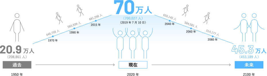 区の人口はこの70年間に着実に増え、2019年7月10日に初めて70万人を突破しました。そして、2020年から2025年にピークを迎え、その後は緩やかに減少を始めます。