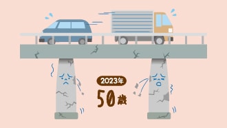 日本の道路や橋、トンネル、港湾、公園などのほとんどは、1950年代〜1970年代の高度経済成長期につくられたものです。このような建設後何十年も経過している「インフラ」(→P55豆知識)が日本中には多くあり、今後のインフラ整備について考えていかなければなりません。